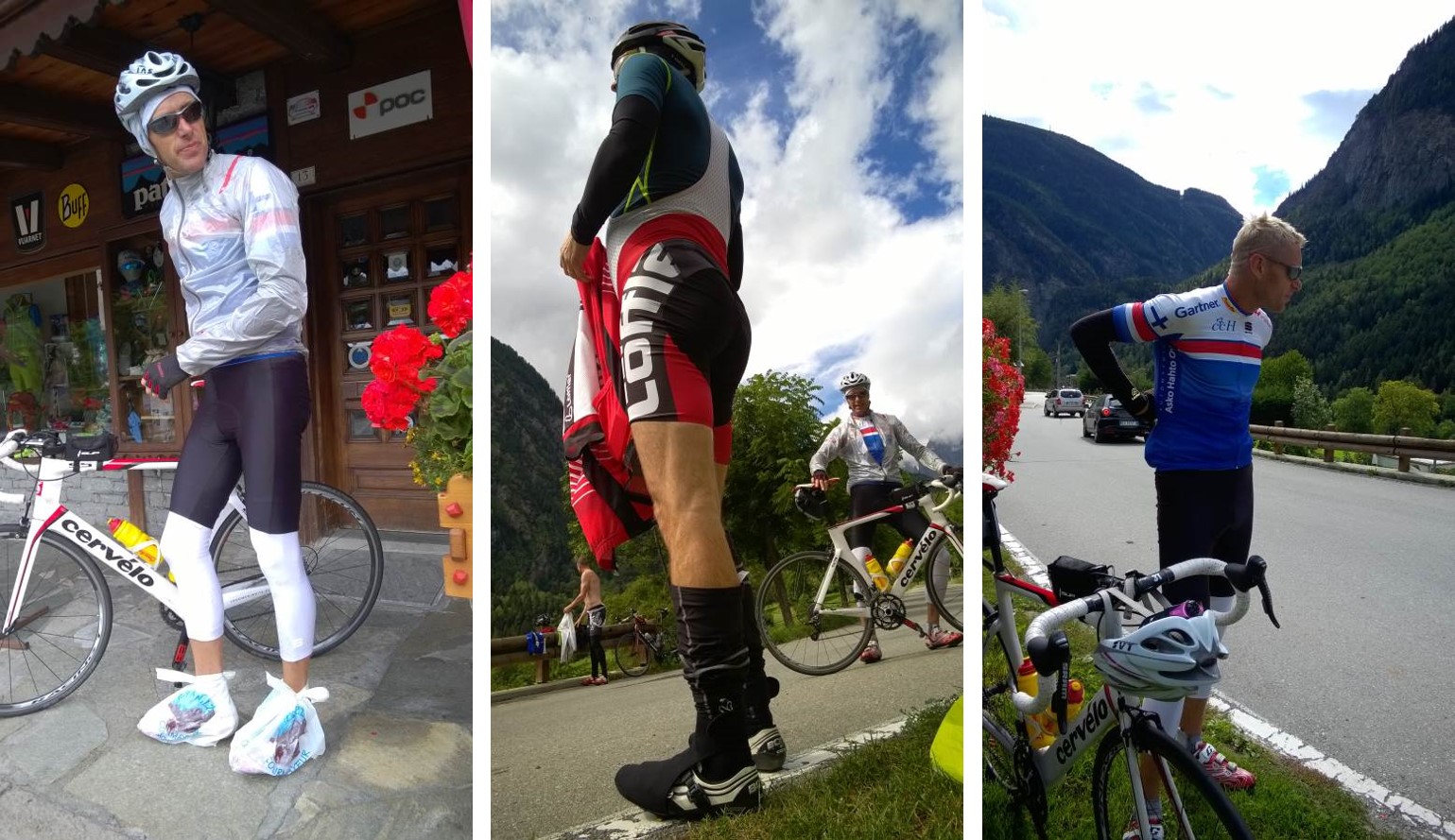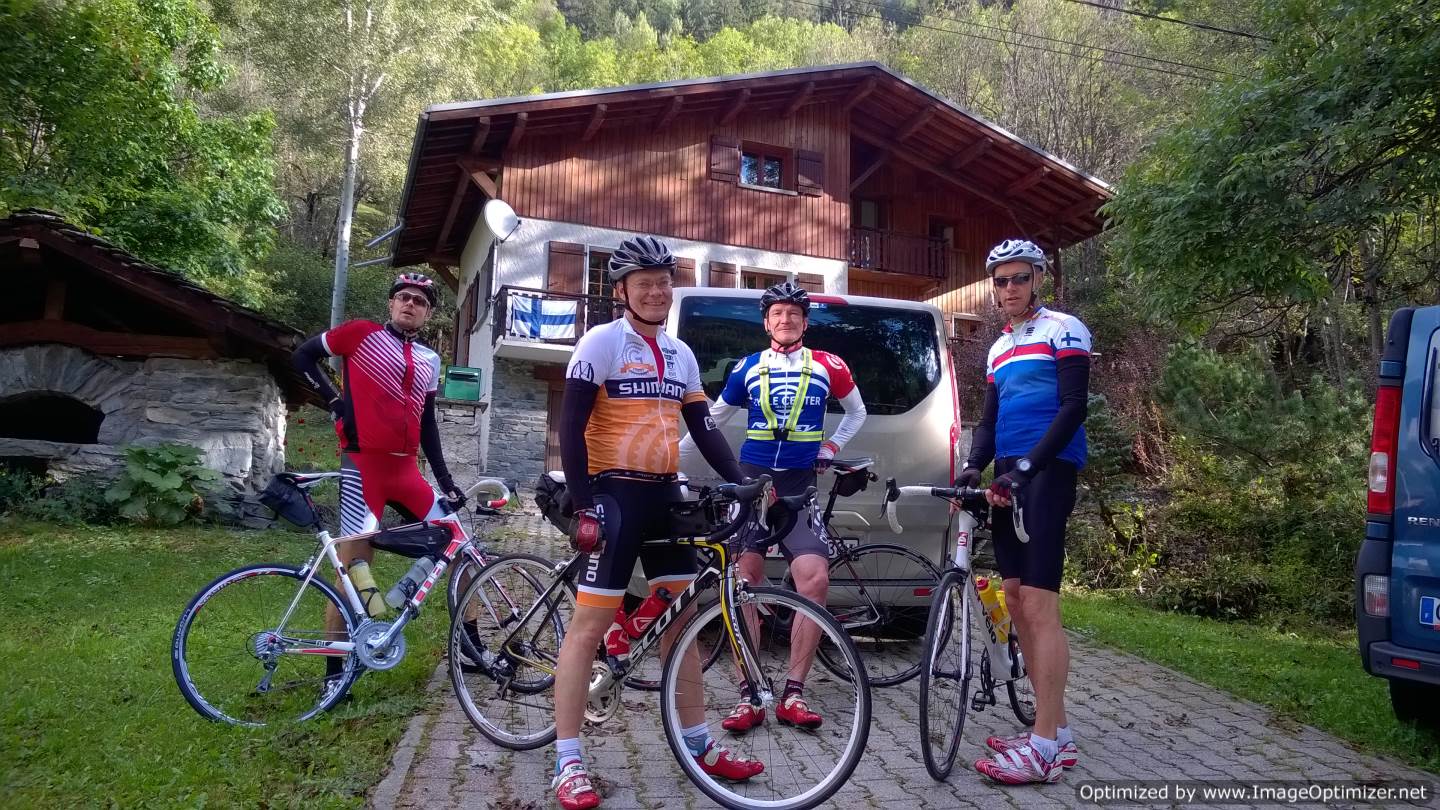Lasku Col du Petit Saint Bernardista kohti Aostan laaksoa antoikin sitten jo esimakua meille varalla olleesta säästä. Huipun kahviossa kaminan lämmöstä ja kahveista nautiskellessamme tuuli oli yltynyt ja sadekuuro kastellut ja liukastanut tien. Joka miehellä tietenkin takapuoli, hanskat ja kengät läpimärkinä jo muutaman sadan metrin laskun jälkeen. Late taisi kärsiä kylmästä pahiten. Jopa siinä määrin, että puolimatkaan osuneessa kylässä hän viritti totaalisesti sääntöjen vastaiset kengänsuojat. Courmeyeriin oli laakson pohjan jälkeen taas pientä nousua, ja sen aikana päästiin lämpimässä auringonpaisteessa vaihteeksi keventämään varustusta.