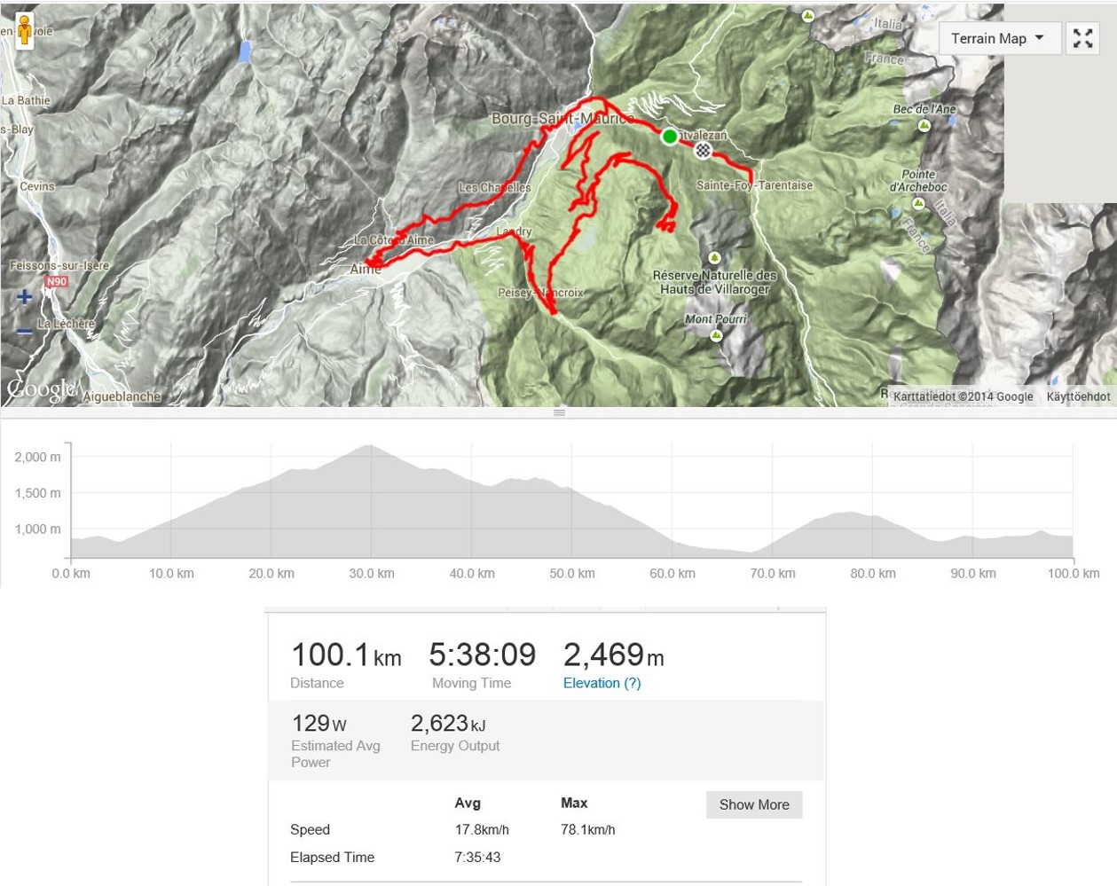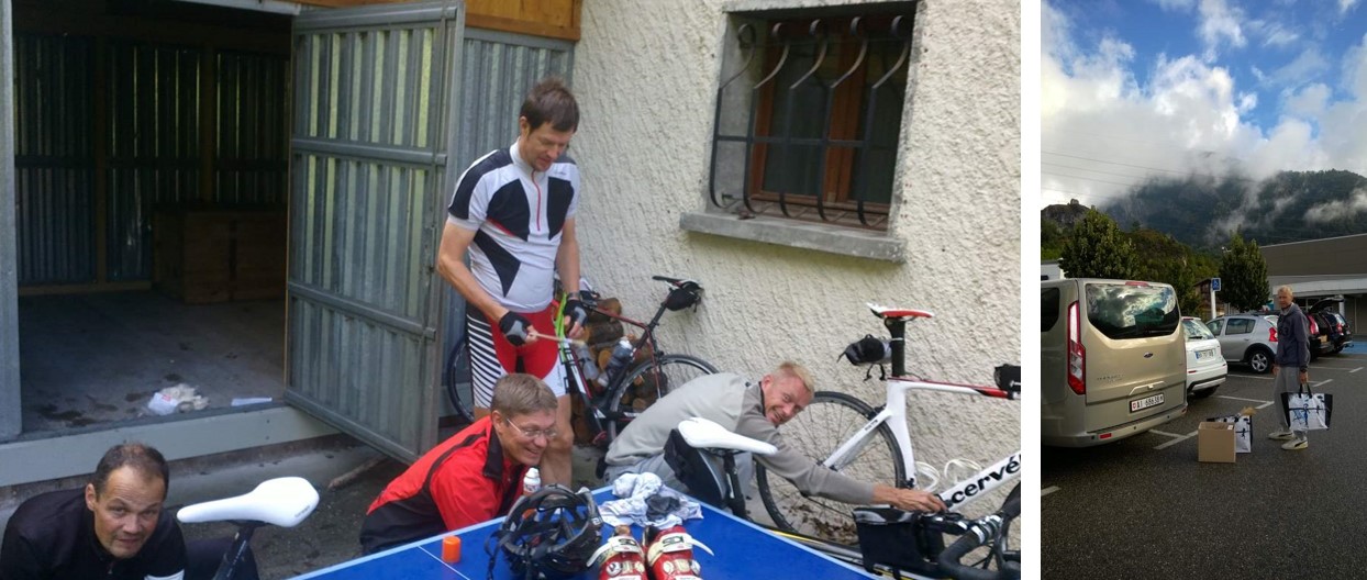Laakson pohjalta löytyi jälleen uusi pyörätie, joka seuraili vauhdikkaan joen vartta Aimen kylään. Sieltä n. 600 metrin nousu ylemmäs rinteeseen Laten parin sadan metrin kaulan turvin vetämänä. Sillä kaulalla tulivat edellispäivän kommentit kuminauhan venymisestä kuitattua. Loppumatka Bourg Saint Mauriceen oli helppoa laskettelua, kukin omalle tyylilleen uskollisesti.