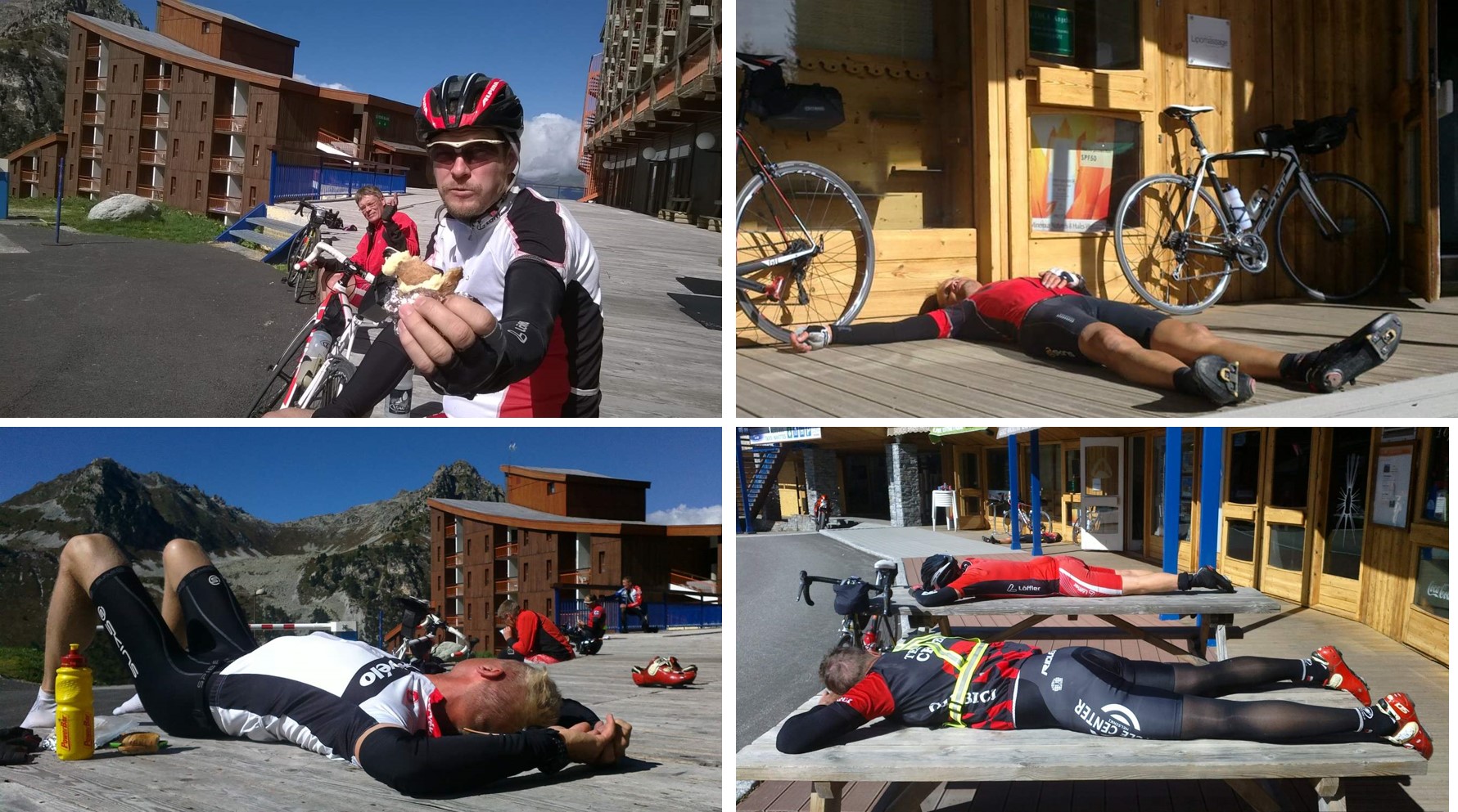WP_20140922_13_58_48_ProLes Arcsin hiihtokeskukset olivat kuin aavekaupunkeja. Teiltä olivat vielä hiekoitussepelit talven jäljiltä poistamatta. Tuloksena kaksi rengasrikkoa. Mitään palveluita ei ollut avoimena. Aamupäivän kahvituokiota jouduttiin siksi lykkäämään iltapäivään. Sen sijaan nautittiin epätavallisen lämpimästä auringonpaisteesta ja omista eväistä. Kofeiinin puutteen ja blogipäivitysten aiheuttaman univelan siivittäminä ei tarvittu kuin sopiva vaaka-asento, ja koko joukkue vaipui unten maille. Lepopäivän teemaan sopivasti.