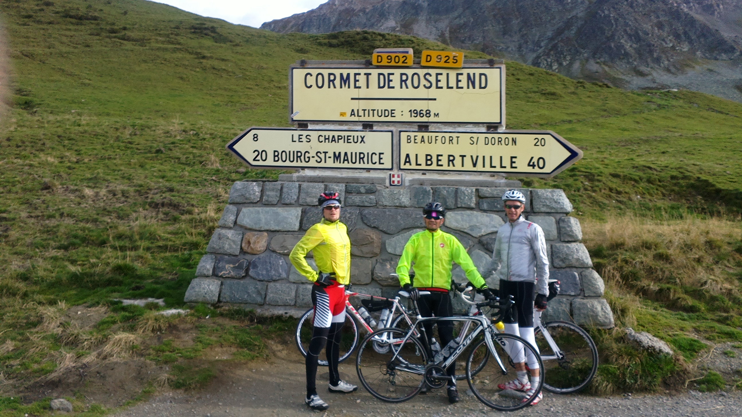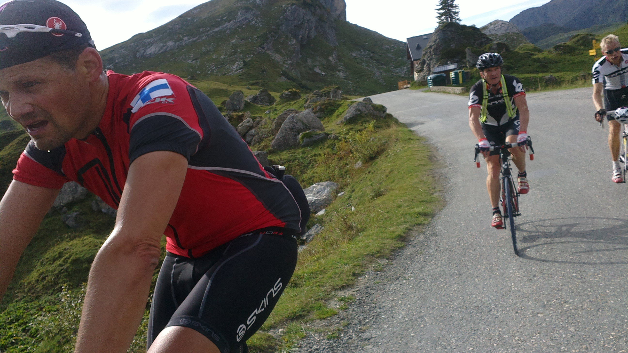 Ja sehän saavutettiinkin leppoisan kipuamisen jälkeen. Sää puolipilvinen, melkein tyyntä. Lämpötila laaksossa siis 22 astetta ja huipullakin vielä 14. Lisää vaatetta päälle ja pikaiset valokuvat. Sitten jäljellä enää lasku Bourg Saint Mauricen kylään ja muutaman kilometrin polkaisu majapaikaamme. Päivän saldo 65km, nousua 1725m aikaa 3h 52min. Ja mikä parasta, suoraan Mixun kattamaan päivällispöytään.